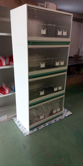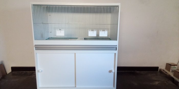 Prodám klec šířka 120cm, hloubka 54cm, výška 100cm. Klec je nerozebíratelná, přední stěnu lze z korpusu vyjmout. 2 plastové vaničky 18cm hluboké. Přední stěna...
