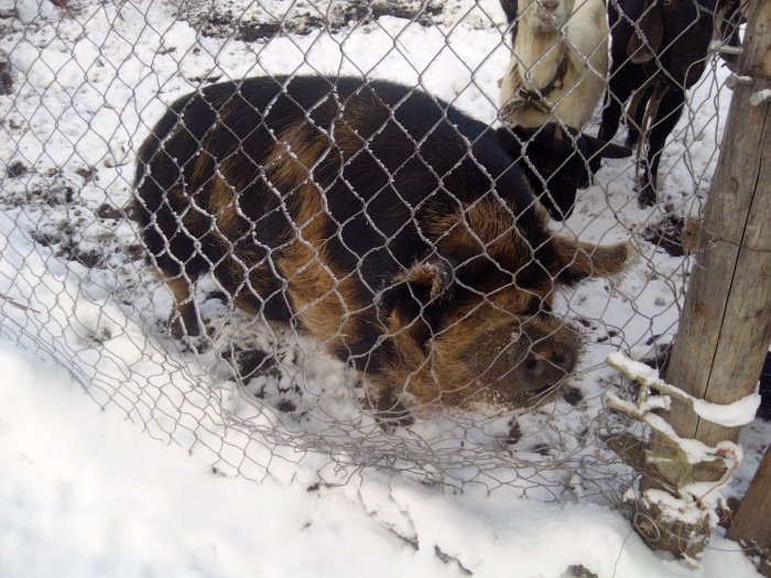 Naše prase Miloš je urostlý samec, takže nejvíc se asi hodí k chovu. Je otcem krásných prasátek, můžeme ukázat fotografie. Přes svoji velikost je ale opravdu výborným společníkem. Naučí se několik povelů, rychle se učí a snaží se vyjít vstříc. Rozumí si i s našimi kozami, psem, kočkou, slepicemi a husami. V přístřešku leží přitulen s kozami a kůzlaty.