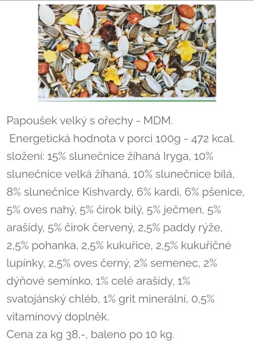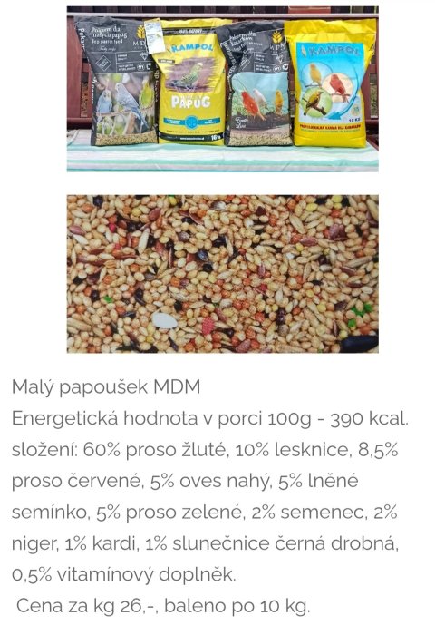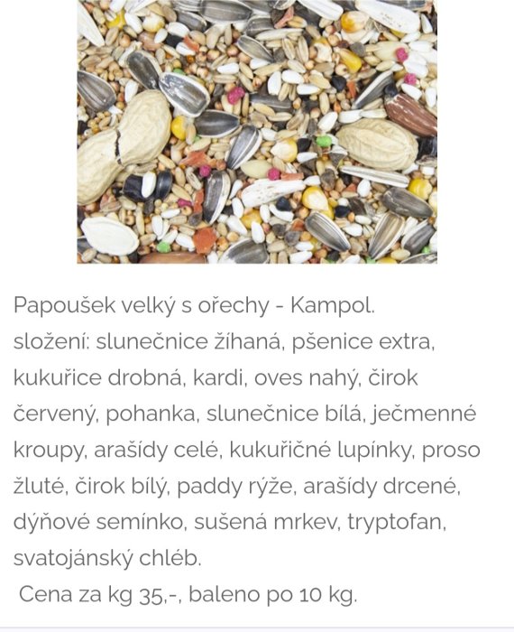 Dále v nabídce: slunečnice černá 20,- kg, slunečnice žíhaná 25, - kg, čirok červený/bílý 20,- kg, pohanka 20,- kg, mungo fazole 45,- kg, arašídy ve skořápce 70,- kg, niger, lněné semínko, pohanka loupaná, svatojánský chléb a další.