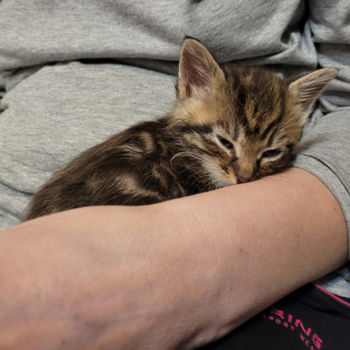 Iskra, narozená cca. na Mikuláše roku 2023, k nám doputovala s maminkou a sourozenci, které někdo nechal ve vlaku. Hned zpočátku prodělala kalicivirozu. Nyní ji čeká první očkování a netrpělivě vyhlíží nový domov.