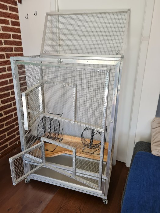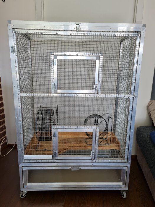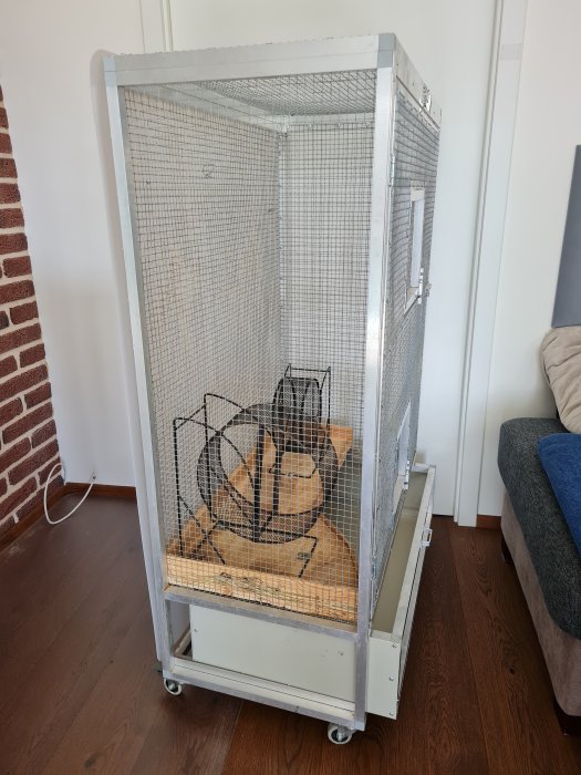 Klec na kolečkách o velikosti 65x54x140cm (ŠxHxV) - vnitřní prostor; vnější výška klece je 152cm, 1 velká dvířka, potom menší dvířka - 2x jedna strana, 1x druhá...