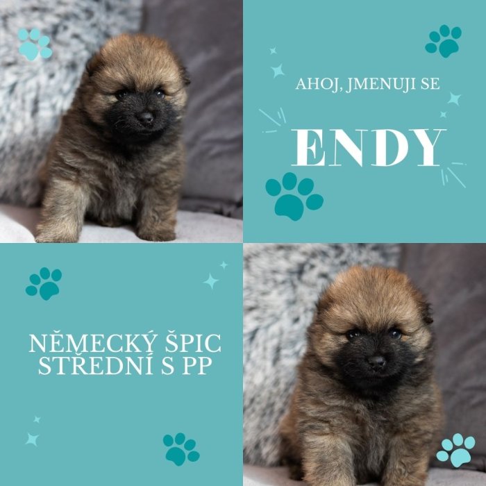 Jmenuje se Endy z Krkonoš. Narodil se 26.1.2024. Je to Německý špic střední s PP.