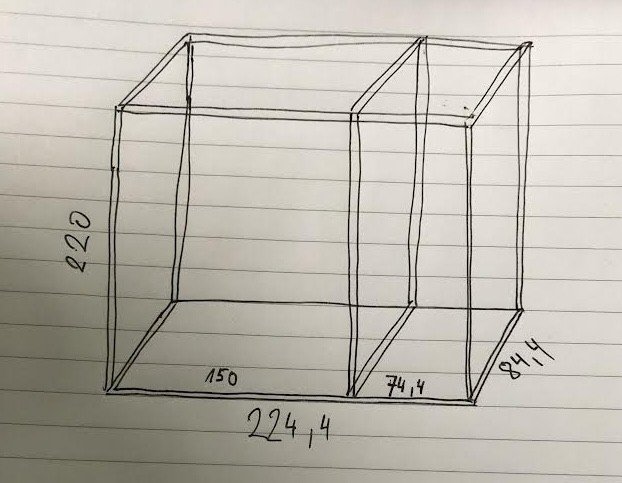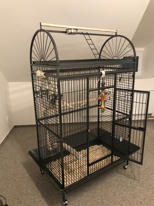 Prodám cca 2 roky starou voliéru vyrobenou na míru po našem kakaduovi. Jedná se o exteriérovou klec užívanou v interiéru domu, tudíž nikdy nebyla vystavena vlivům počasí. Klec je přepažená na dvě části - viz nákres a rozdělující přepážku lze vyndat. Jedná se tedy vlastně o 2 klece v jedné - pro papoušky sousedy. Je vybavena dvěma dvířky a dvěma otočnými moduly na 3 misky. Zadní strana je bez výpletu - přidělaná ke zdi. Pletivo Esafort 19 x 19 mm síla drátu 1,5 mm. Vhodná i pro větší papoušky. Ke kleci mohu přidat zdarma interiérovou klec na kolečkách starou 4 roky, která byla poslední dva roky využívaná jako venkovní a nese známky opotřebení vlivem počasí. Pouze osobní odběr v Plzni.