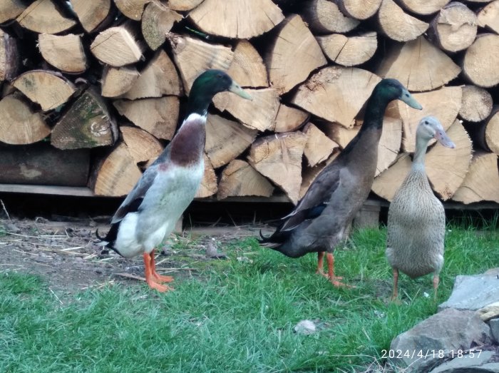 Prodám 3 kačery a 1 kachnu. Líhnutí letos v červenci. Kačeři po 150 kč, kachna 250 kč. Na fotce zleva 3 kačeři, vpravo kachna.