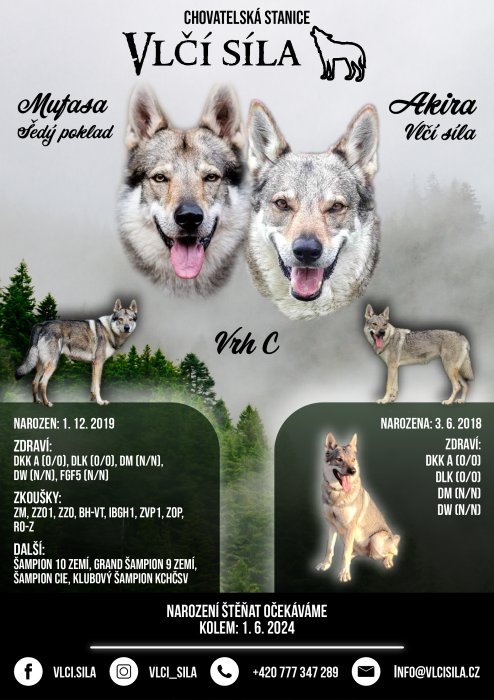 Chovatelská stanice Vlčí síla přijímá rezervace na štěňátka vrhu C. Předpokládaný termín narození je kolem 1. června. Maminkou štěňat je Akira Vlčí síla (Akča žije rodinným životem, je velmi přátelská, miluje zápřah a jede jako mašina), tatínkem je Mufasa Šedý poklad (Moody je na výstavách velice úspěšný, se svou paničkou krásně spolupracují a není pro ně problém skládat zkoušky).
