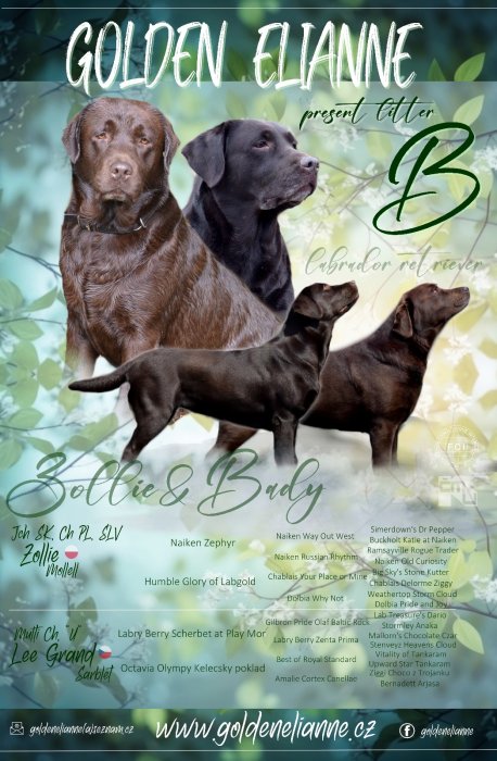 ChS Golden Elianne zadá čokoládová štěňátka (pejsky) labradorů z perspektivního spojení O: Multi Ch Lee Grand Sarblet "U", M: JCh SK, Ch SLV, PL Zollie Mollell, oba rodiče jsou výstavně i pracovně úspěšní, zdraví, s výbornou povahou. Štěňátka budou k odběru od pol. května 2024. Více info na www.goldenelianne.cz
