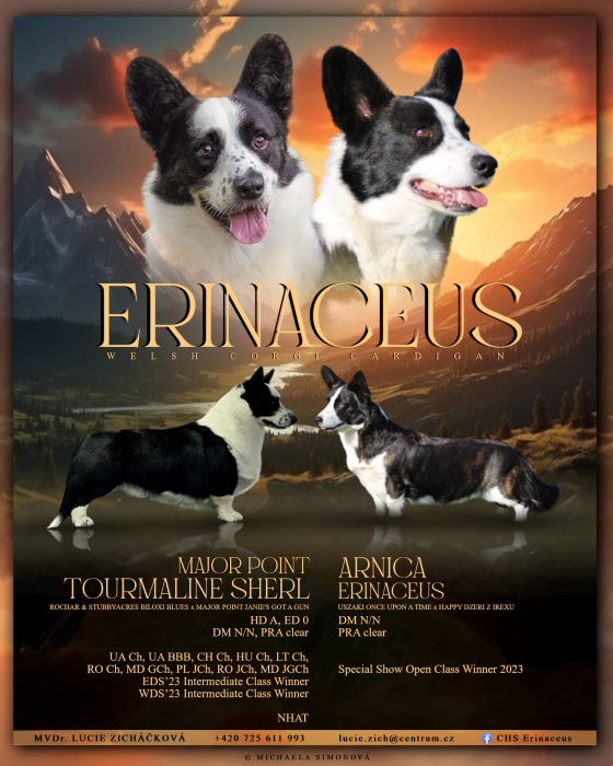 Chovatelská stanice Erinaceus přijímá rezervace na štěňata plemene Welsh Corgi Cardigan narozená 26. 4. 2024. Otcem štěňat je Světový vítěz 2024 Major Point Tourmaline Sherl. Více informací na https://www.facebook.com/CHSErinaceus nebo na mailu lucie.zich@centrum.cz.