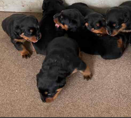 Štěňata rotvajlera registrovaná CKC narozená 26. února - READY TO GO. Mají první sadu očkování, jsou odčervená a čipovaná. K dispozici 4 fenky. Rodiče mají několik krevních linií mistrů světa z východní Evropy. Štěňata se prodávají na základě nemnožitelské smlouvy