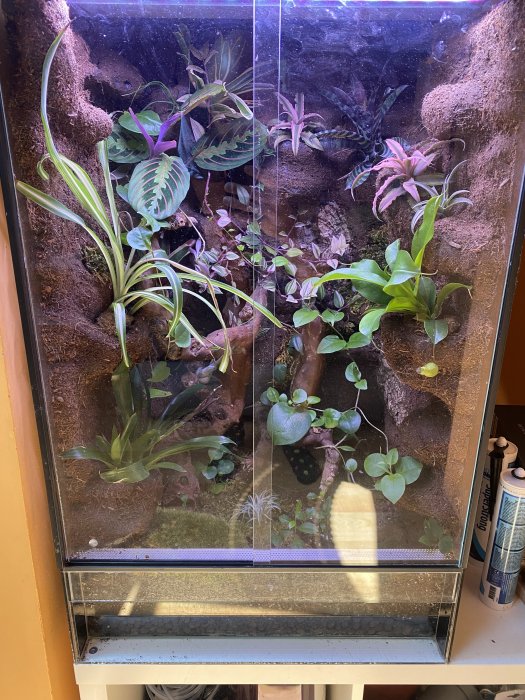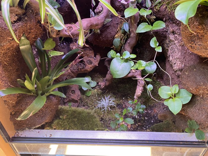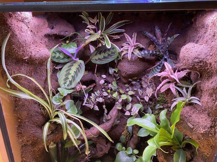 Prodám terárium, šířka 40cm, hloubka 50cm, výška 80cm. Terárium nabízím kompletní tak jak je na foto…světlo sinkor 40cm ovládané přes telefon ( stmivani, atd…) půl roku staré. Rostliny viz. Foto. Je možná domluva a prodej teraria zvlášť…