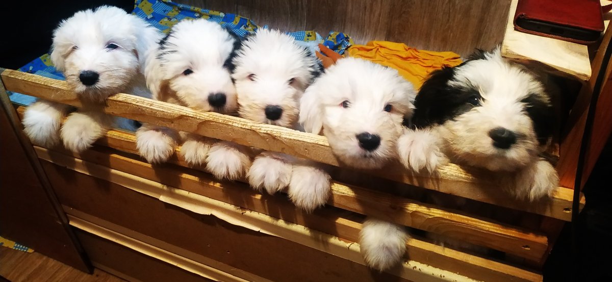 Čistokrevná štěňata bobtaila .Mají klidnou a kamarádská povahu. Štěňata budou odčervená, očkovaná.