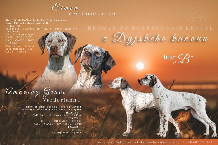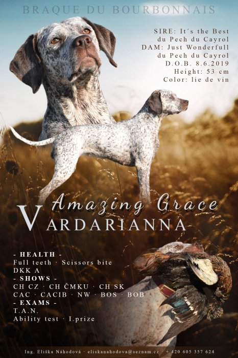 Jedná se o zahraniční spojení. Matkou vrhu je Amazing Grace Vardarianna, otcem Simon des Cimes d´Or.