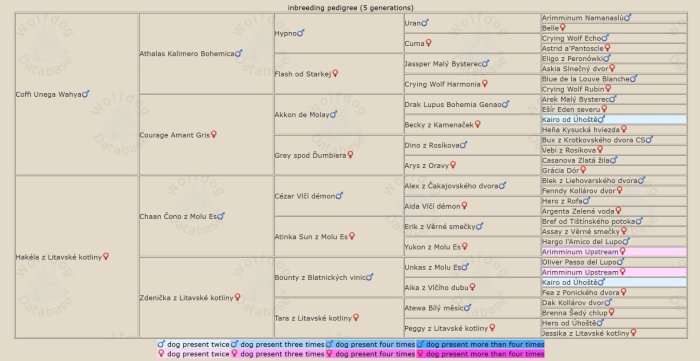 Otcem štěňátek je Coffi Unega Wahya (5 let, A67 K9 Oh Qr Xv53 Xf107,5,(CZ)). Oba rodiče jsou zdraví, na sledované znaky negativní, kyčle i lokte nulové. Matka štěňat absolvovala bonitaci bez přípravy s výborným bonitačním kódem (A65 H2,6 L11 Og QR Xv53,1 Xf107,7(CZ)) Oba rodiče štěňátek jsou vyrovnaní, krásní, kontaktní rodinní psi. Milující děti a své páníčky. U budoucích potomků je velký předpoklad jak pracovních, tak i výstavních úspěchů, vzhledem k předkům. Prarodiče štěňat jsou oba Kluboví šampioni, Chaan Čono z Molu Es (děda) je velice úspěšný pes, jak po stránce výstavní (tituly z národních i mezinárodních výstav) tak i po stránce pracovní s 13ti zkouškami z výkonu ve sportovní kynologii, Zdenička z Litavské Kotliny (babička) s 18ti zkouškami z výkonu.