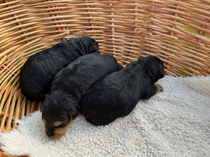 WT: Nabízím štěňata velšteriéra s průkazem původu. Oba rodiče lovecky vedeni. O: Arny od Getyho-V; M:Lemmy z Cetoraze,V2. Odběr 6_2025.
