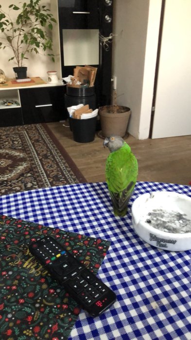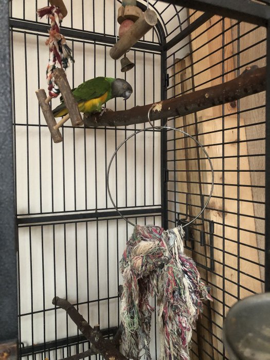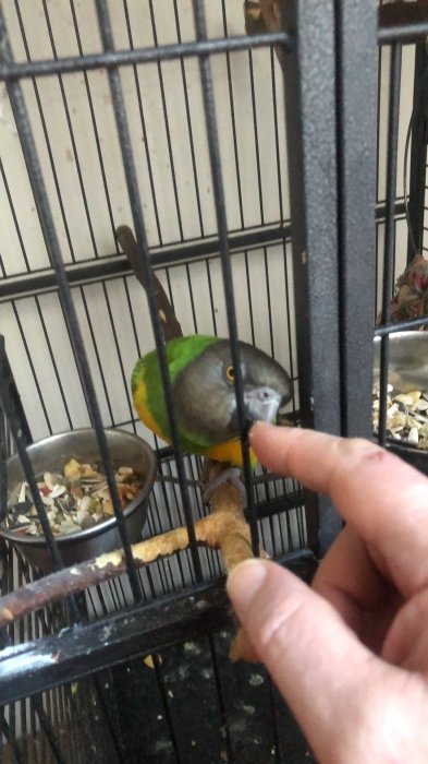 Prodám ochočeného papouška senegalského 8 levého i s kleci nebo bez klece cena bez klece 5000,- Kč klec 2000 .-Kč na klec je zvyklí