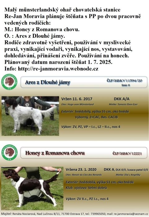Přijímáme rezervace na štěňata MMO s PP z plánovaného vrhu C. Re-Jan Moravia po lovecky vedených, zdravotně vyšetřených rodičích. Skvělí parťáci do rodin, na výlety, veselí oddaní, učenlivý psi milující děti a svou rodinu. Všestranně využitelní lovečtí psi jak na souši tak ve vodě. Oba rodiče aktivně používaní v myslivosti, mají zkoušky lovecké upotřebitelnosti - používání v lovecké praxi, na honech, i při individuálním lovu, dosledech, dohledávkách, vlohoví psi mají radost z práce, vynikající vodaři, skvělí nenároční, náruživí pracanti, nepostradatelní pomocníci v myslivosti a při lovu. Vynikající poslušnost a dobrá ovladatelnost, na honech chodí bez vodítka. Využívání v myslivosti není podmínkou. K rodině jsou přátelští, milují děti i svou rodinu i dům zodpovědně pohlídají.