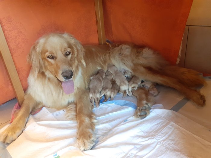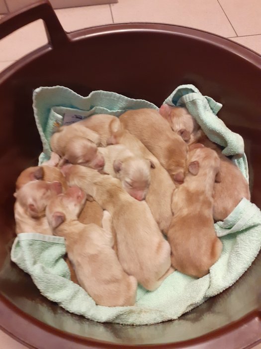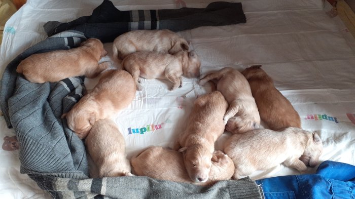 Nabízím štěňátka bez PP, narozená 30.6.2025, 7 pejsků a 3 fenky plavé barvy (fenečky jsou již zamluvené).
