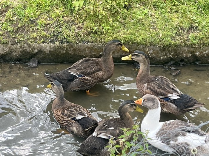 Prodám 3 kačery a 1 kachnu. Líhnutí letos v červenci. Kačeři po 150 kč, kachna 250 kč. Na fotce zleva 3 kačeři, vpravo kachna.
