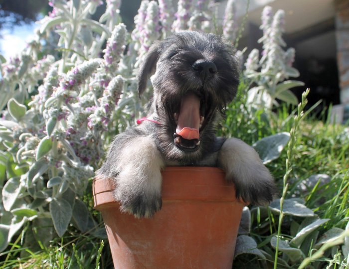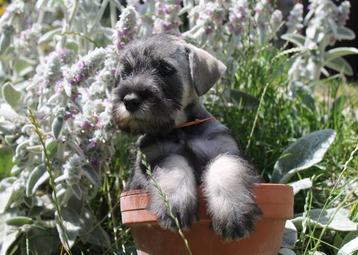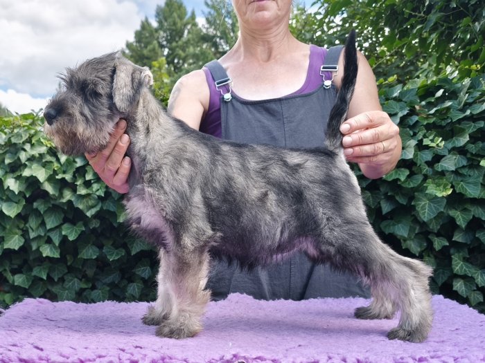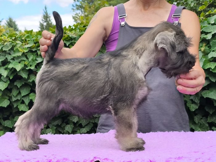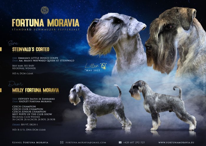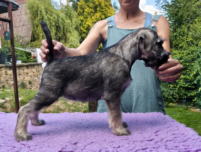 štěňata středních kníračů pepř a sůl, hned k odběru. 1 pejsek Quinto a 3 holčičky Qeery & Queen Mary & Q-Chera Fortuna Moravia se těší na své nové majitele.