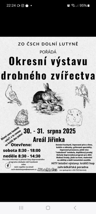 Srdečně Vás opět po roce zveme na Okresní výstavu drobného zvířectva! Doražte za námi poslední srpnový víkend do areálu Jiřinka v Dolní Lutyni! Máme pro vás opět připraveny bohatý doprovodný program.. A samozřejmě bohatá TOMBOLA!!