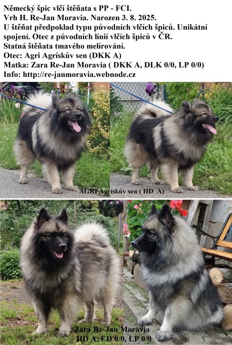 Německý špic vlčí / keeshond - chovatelská stanice Re-Jan Moravia FCI prodá štěňata s PP FCI. Rodiče zdravotně vyšetřeni, vynikajících povah i exteriéru. Ideální ostražitý hlídač a společník do rodiny a k RD. Velice líbiví, elegantní, nenároční psi. Štěňata budou s PP, mikročipem, EU petpassportem, kompletně očkovaná, otužilá, zvyklá již být celodobě venku v době odběru. Jsou to vynikající, ostražití hlídači domu a dvoru i milující rodinní psi, oddaní ochránci své rodiny. Vhodní k dětem i k zvířatům. Nejsou uštěkaní a nemají sklony k toulání. Lehce vychovatelní a dobře ovladatelní psi střední velikosti. Německý špic vlčí / keeshond je veselý, nenáročný, inteligentní pes vhodný do rodin s dětmi i jako společník a perfektní hlídač k RD i společník do bytu a na procházky. Má bohatou srst, která není náročná na údržbu, samočistící, stačí občas vyčesat. Přizpůsobivý, nekonfliktní, líbivý pes veselé povahy vhodný i pro začátečníka. Může být chován celoročně venku. Zdravý, otužilý, nenáročný, dlouhověký pes. Ostrava http://re-janmoravia.webnode.cz