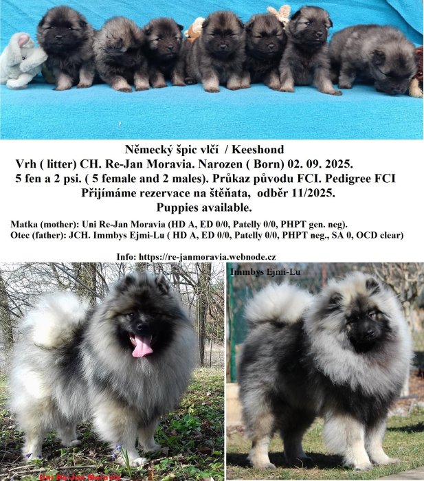 Německý špic vlčí / keeshond prodám krásná, statná štěňata kvalitní krve s PP. Štěňata z vrhu H. volní jen pejsci k odběru ihned, Štěňata z vrhu CH. volné fenky i pejsci k odběru 10/25. Rodiče zdravotně vyšetřeni, vynikajících povah i exteriéru. Chovatelské i výstavní předpoklady. Ideální ostražitý hlídač a společník do rodiny a k RD. Velice líbiví, elegantní, nenároční psi. Štěňata jsou s PP - FCI, mikročipem, EU petpassportem, očkovaná, otužilá, zvyklá již být celodobě venku v době odběru. Jsou to vynikající, ostražití hlídači domu a dvoru i milující rodinní psi, oddaní ochránci své rodiny. Vhodní k dětem i k zvířatům. Nejsou uštěkaní a nemají sklony k toulání. Lehce vychovatelní a dobře ovladatelní psi střední velikosti. Německý špic vlčí / keeshond je veselý, nenáročný, inteligentní pes vhodný do rodin s dětmi i jako společník a perfektní hlídač k RD i společník do bytu a na procházky a výlety. Má bohatou srst, která není náročná na údržbu, samočistící, stačí občas vyčesat. Přizpůsobivý, nekonfliktní, líbivý pes veselé povahy vhodný i pro začátečníka. Může být chován celoročně venku. Zdravý, otužilý, nenáročný, dlouhověký pes. Ostrava http://re-janmoravia.webnode.cz