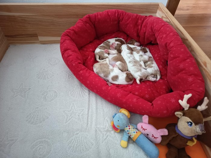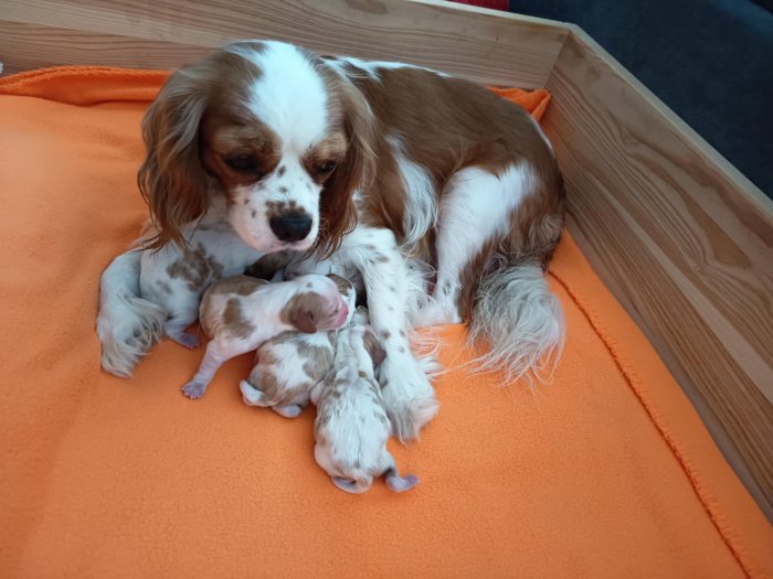 Dobry den prodám štěňátka Kavalíra bez pp. Narozena 7.9. 2025 k odběru začátkem listopadu. Budou 3x odčervená, očkovaná a cipovana. Cena za jedno štěně je 16000. Jsou to 4 fenečky a dva pejsci, jeden je jiz rezervovaný. Rezervační poplatek je 6000.