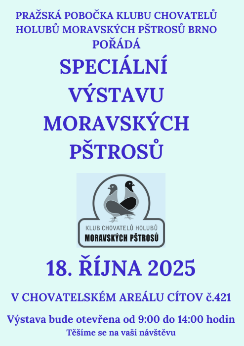 Pražská pobočka Klubu chovatelů holubů moravského pštrosa Brno pořádá speciální výstavu holubů MP