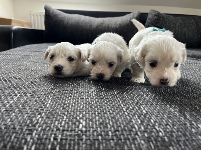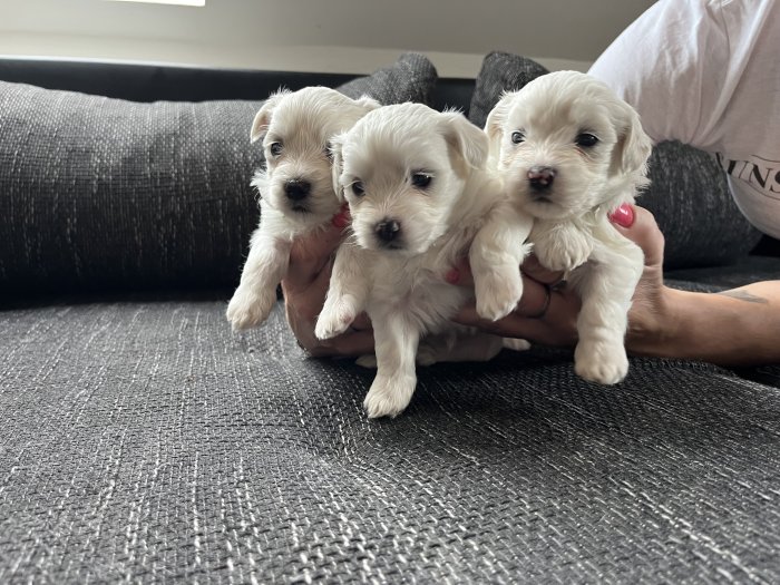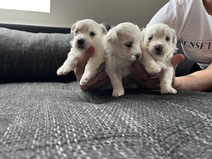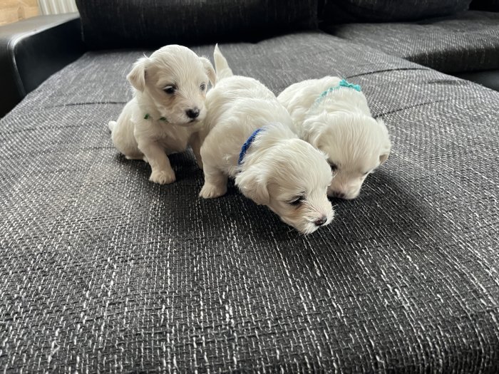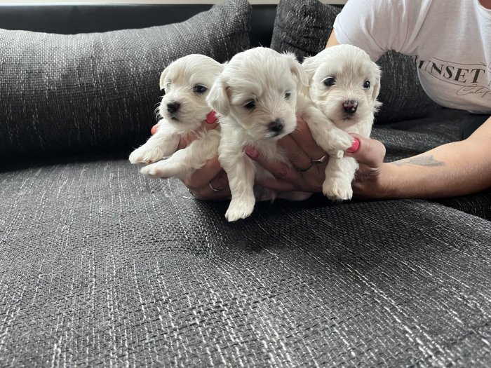 Nabízíme krásná štěňátka maltézského psíka bez PP, narozená 28.8.2025, všichni tři jsou pejsci.