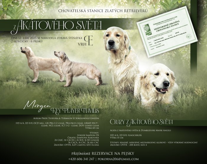Radostná novinka z chovatelské stanice z Akátového světa - dne 12. září 2025 přišlo na svět 8 zdravých zlatých pokladů - 2 krásné holčičky a 6 udatných kluků.