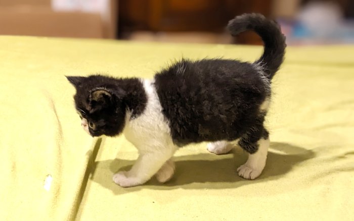 Je to kocourek Aaron: černo-bílý bikolor s bílým bříškem a tlapkami, taky má na hřbítku bílý proužek.