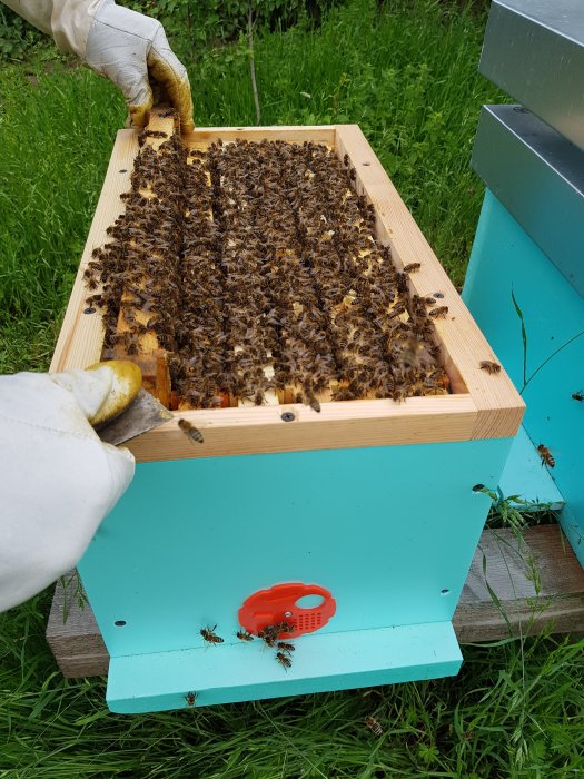Letošní oddělky včelstva matky f1 modrá v přeléčení a zakrmená v nových úlech na 2 nástavcích 39*24cm Varoadno z masivu (smrk)osazená zateplená stříška z...