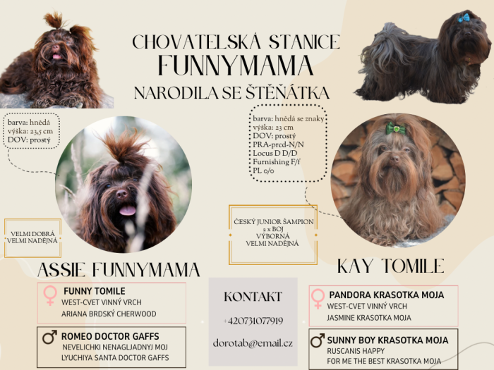 Chovatelská stanice FUNNYMAMA nabízí k prodeji štěňátka ruské barevné boloňky (fenky i pejsek) s průkazem původu, narozená 27.9.2025, k odběru koncem listopadu.