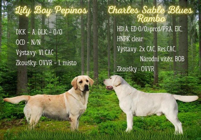 CHS Boy Pepinos nabízí žlutá štěňátka LR s papíry původu po zdravých exteriérově pěkných rodičích. Jsou vhodná na výcvik canisterapie, lovecký výcvik a budou Vám i tím nejlepším kamarádem. Pokud o ně máte vážný zájem, zavolejte a domluvte si návštěvu.