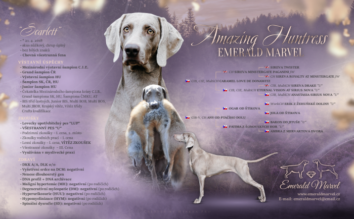 Matka budoucích štěňat je odchovaná v naší CHS – Amazing Huntress Emerald Marvel (SCARLETT) – mezinárodní šampionka, šampionka krásy několika zemí, vítězka plemene, nejlepší mladý jedinec výstavy, aktivně využívaná v myslivecké praxi. Má složeny všechny typy loveckých zkoušek – podzimní (2. místo), zkoušky vodní práce, lesní zkoušky (vítěz), barvářské zkoušky (2.místo) a všestranné zkoušky. Má nadstandardní zdravotní vyšetření – vyšetření kyčlí a loktů, vyšetření srdce - vše s negativním výsledkem. Po rodičích je negativní na choroby postihující výmarské ohaře – DM, MH, HUU, HYM, SD, DAS.