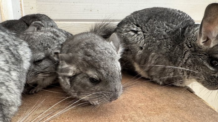 Nabízím tři roztomilá mláďata činčil, narozená 15. srpna 2025 – dvě samičky a jednoho samečka, všichni v barvě standard grey. 🐭