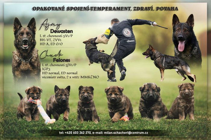adám vlkošedá štěňata německých ovčáků, opakované spojení pro temperament-zdraví-povahu, otec vícemistr světa, dvojnásobný vítěz MMČKNO Chuck Felones, IGP3, velmi dobrý, I. třída chovnosti, 5JV1/P, matka Ajmy Dewasten, ZVV1, velmi dobrá, I. třída chovnosti, 5V1/P. Odběr konec listopadu, nezávazná návštěva vítána, štěňata budou v době odběru čipovaná, tetovaná, očkovaná. Více na http://www.bohemia-abakan.wbs.cz