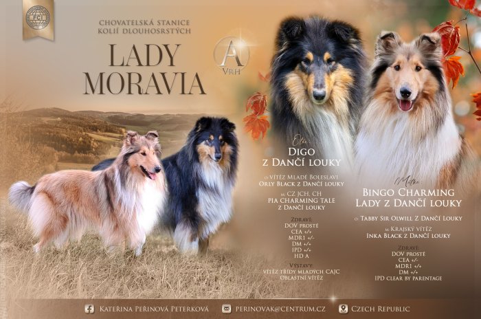 Chovná stanice Lady Moravia nabizi 2 zlaté a 1 trikolor pejsky. Mají výbornou povahu po svých rodičích,budou skvělými rodinnými mazlíčky,ale mají i předpoklad pro chov a výstavy. Ke svým novým majitelům se mohou vydat v polovině listopadu, kdy budou řádně odčervená, očkovaná,čipovaná a vyšetřena na dědičné oční vady.