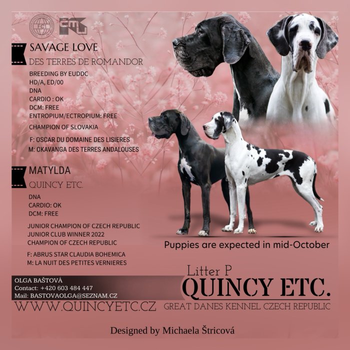 Chovatelská stanice Quincy etc. nabízí štěňátka německé dogy v barvě černá, skvrnitá a šedý tygr. Oba rodiče jsou zdravotně testovaní, milé a přátelské povahy. V případě zájmu o štěňátko nás neváhejte kontaktovat. Olga Baštová tel. 603 48 44 47 bastovaolga@seznam.cz www.quincyetc.cz