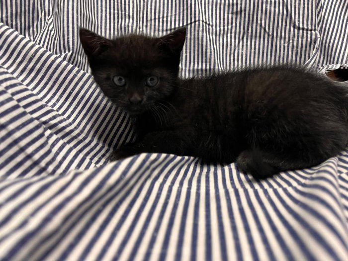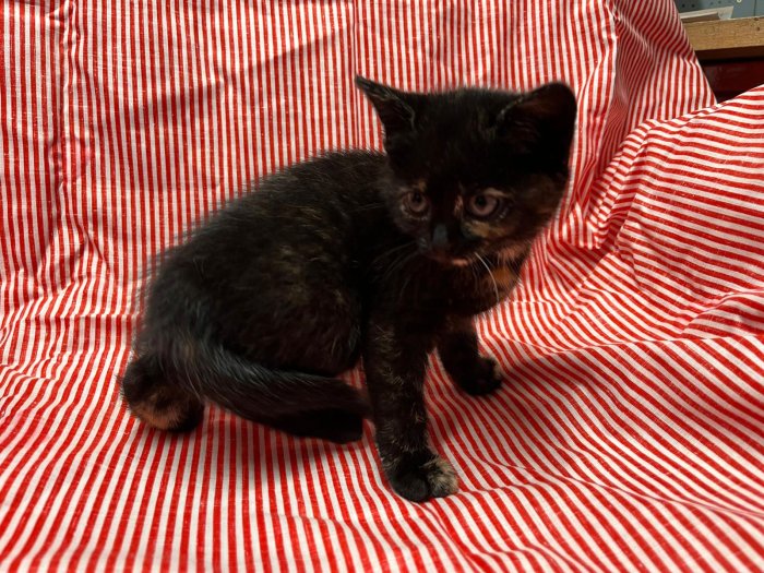 Asi tříměsíční kočička, nyní s námi již velmi opatrně komunikuje, zatím nemá ráda změny, ošetřená proti parazitům, rozvakcinovaná.