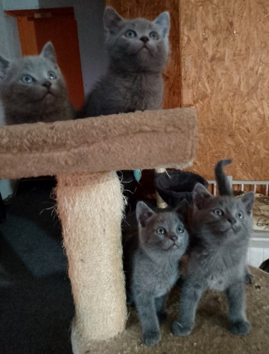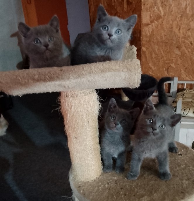 Prodám britské modré koťátka bez PP. Staří 8 týdnů. Jedná se o dvě holcicky a dva kluky.Koťátka jsou zvyklá v bytě , jsou zvyklá na malé pejsky a jsou naučená na WC. Jsou zvyklá na děti. Poslední dvě fotky je nafocena i mamina. Budou 4x odčervená a očkovaná. Odběr možný před Vánoci. Prosím, jen vážní zájemci a prosím , volejte.