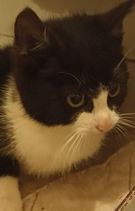 Asi tříměsíční kočička, nyní s námi již velmi opatrně komunikuje, zatím nemá ráda změny, ošetřená proti parazitům, rozvakcinovaná.
