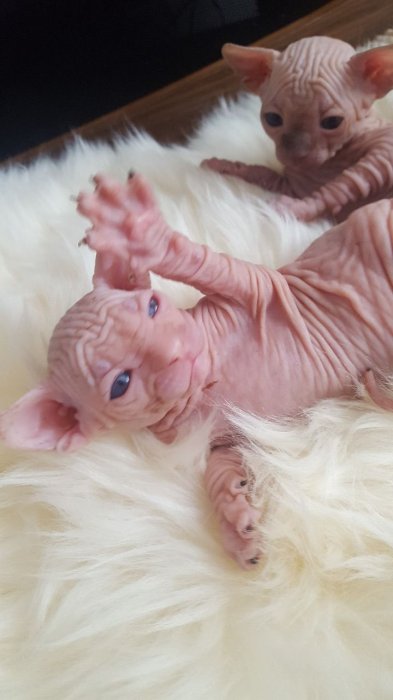 Koťata sphynxů. Prodáváme naše krásná koťata. 1x zrzavého sphynxe. 1x šedé feny. Všechna koťata jsou trochu vycvičená na pevnou stravu, velmi hravá a milují mazlení.