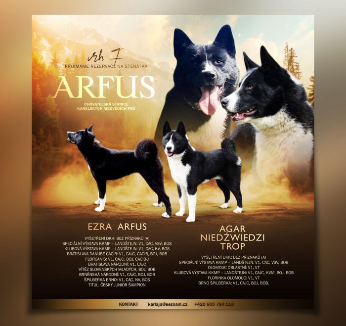 Chovatelská stanice ARFUS přijímá rezervace na štěňátka karelského medvědího psa po výborných rodičích bez genetických vad narozená 27.9.2025. K odběru koncem listopadu 2025. Případnému zájemci zašlu fotografie štěňátek k výběru.