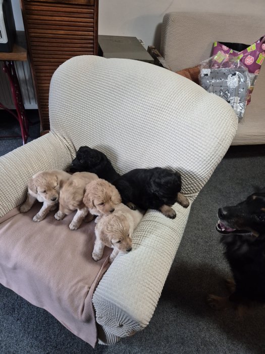 Celkem 6 štěňat: Černí se znaky 1x fenka, 1x pejsek, plaví 1x pejsek a 3x fenka.