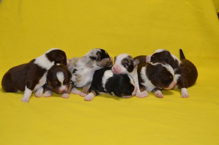 Štěňátka fenečky jsou v barvě blu merle,hnědá a černá trikolor.Kluk v barvě blu merle a fenka předpoklad k modrým očím.