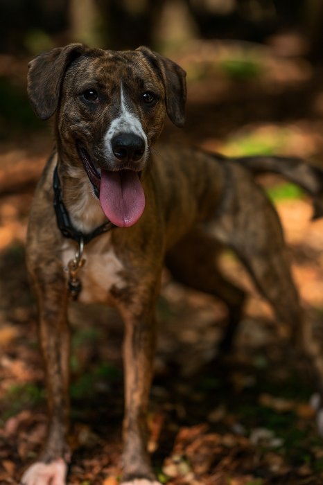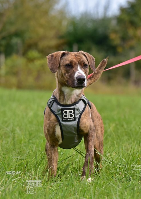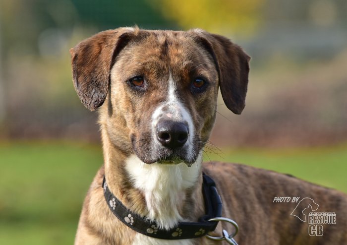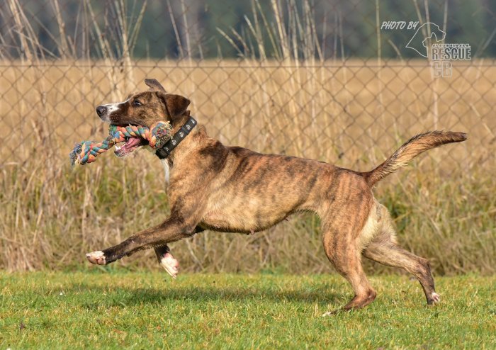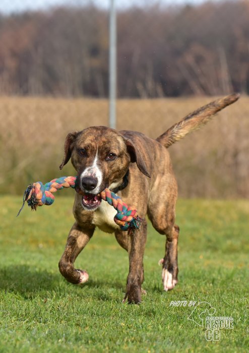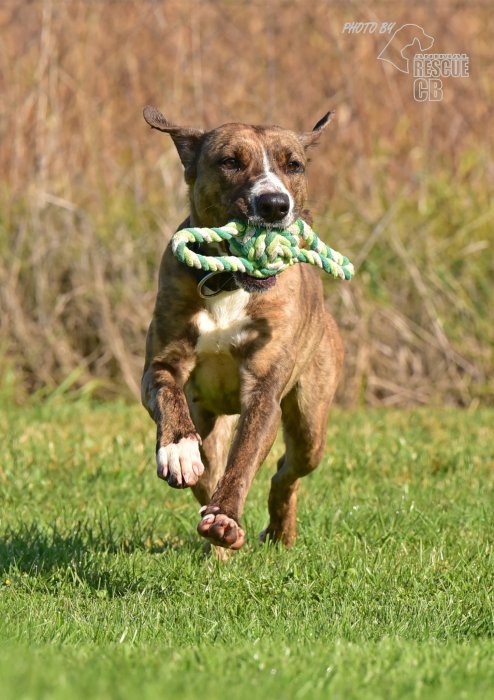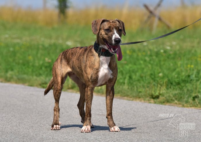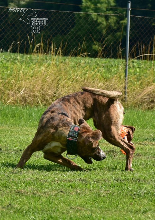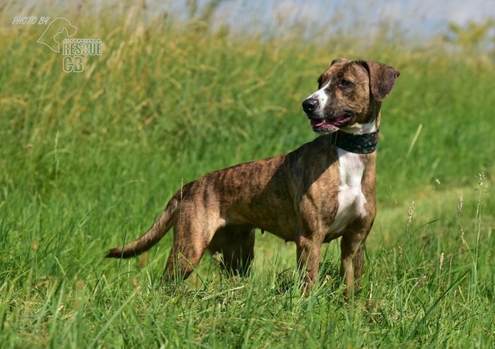 Rok stará fena, temperamentní, učenlivá, ke známým lidem milá, celkově velmi aktivní, trochu hysterka. Nevhodná k malým dětem a jiným zvířatům. Ošetřená proti parazitům, označená mikročipem, vakcinovaná. Tel.: 777214680