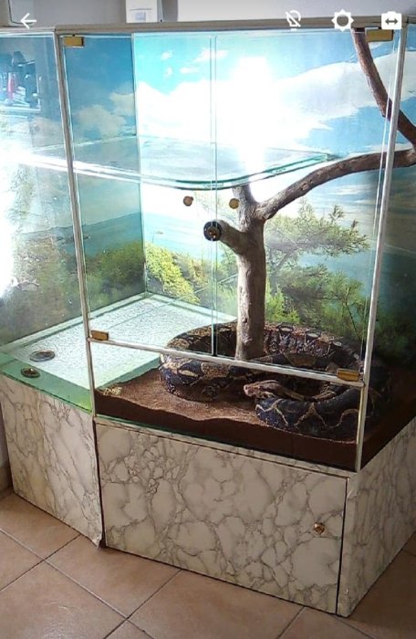 Prodám používané rohové terárium po hroznýšovi, vhodné pro panelák. Š102, H61, h42, v87, od země V126. V teráriu jsou nutné drobné opravy. Osobní odvoz nutný!