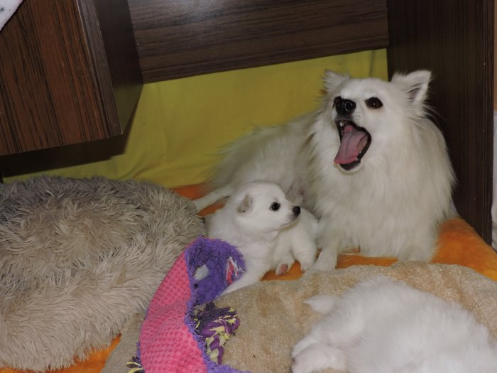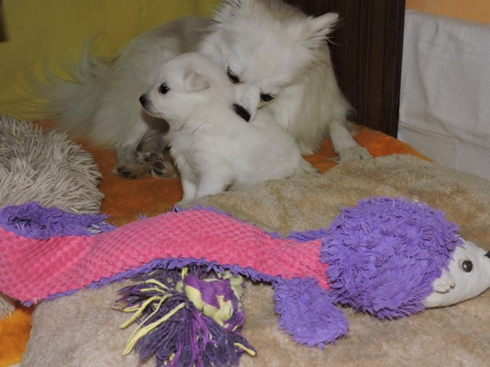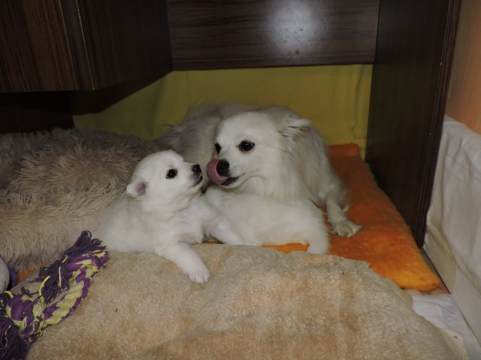 Štěně je čistě bílé po výborných rodičích. Otec Kunhegyesi Bleki Eminem Mackó, matka Yashika První sníh. Špic je výborný společník na procházky, věrný svému pánovi. V dospělosti má v kohoutku výšku okolo 35 cm. Štěně je s PP, očkováno, odčerveno a čipováno. K odběru je koncem února.
