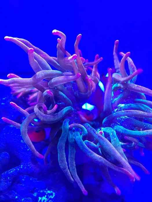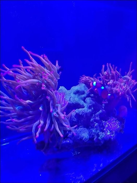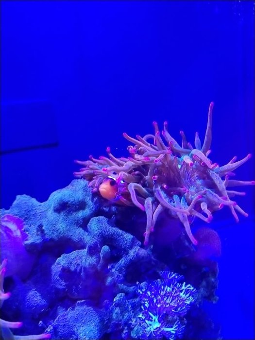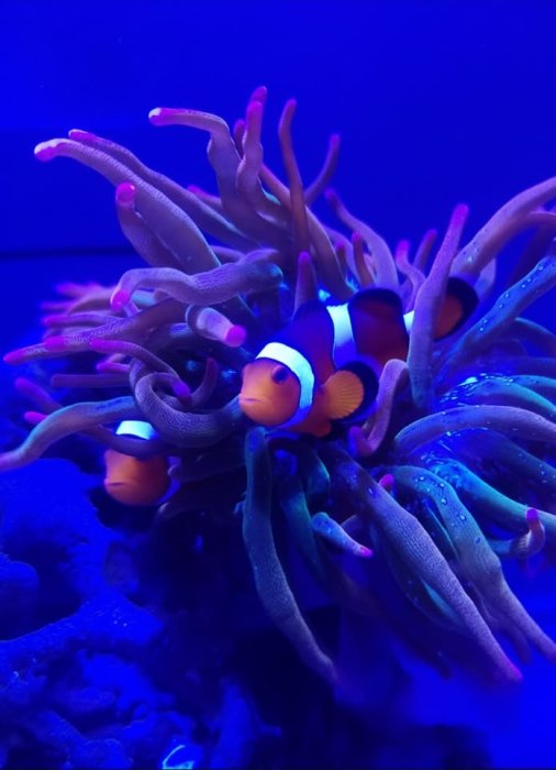 Součástí je kompletní, již zaběhnutý život: dominantní korálový kámen se sasankami, pár klaunů Ocellaris (Nemo), kteří je běžně obývají, pulzující Xenie a další drobní mořští živočichové. Technika zahrnuje akvárium s integrovanou filtrací, profesionální LED osvětlení, odpěňovač, čerpadlo, topítko a další potřebné vybavení. Prodávám kompletní sestavu tak, jak je na fotografiích.