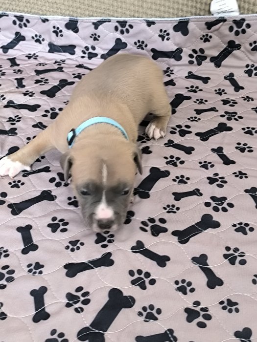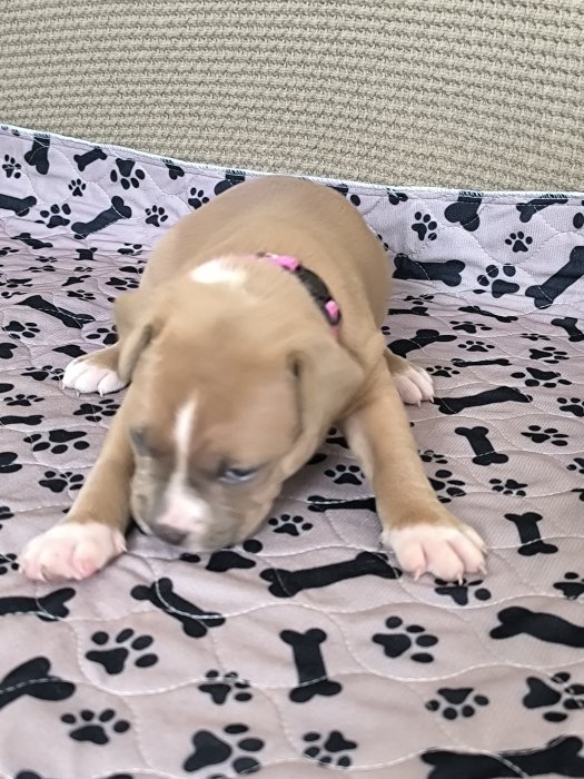 Prodám štěňátko staforda fenka dva měsíce stará odčervená, naočkovaná.Do dobrých rukou děkuji.